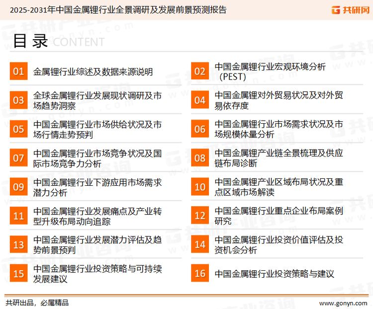 共研网发布的《2025-2031年中国金属锂行业全景调研及成长前景预测演讲》演讲中的材料和数据来历于对行业息的阐发、对业内资深人士和相关企业高管的深度,以及共研阐发师分析以上内容做出的专业性判断和评价。阐发内容中使用共研自从成立的财产阐发模子,并连系市场阐发、行业阐发和厂商阐发,可以或许反映当前市场现状,趋向和纪律。